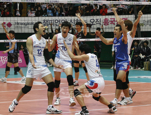 캐피탈의 경기에서 대한항공 장광균이 3세트에서 수비에 성공한후 선수들과 기뻐하고 있다.