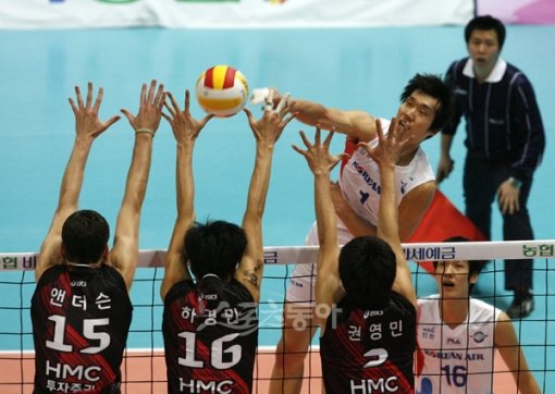 13일 인천도원시립체육관에서 열린 2009∼2010 V리그 남자부 경기에서 대한항공의 신영수가 현대캐피탈의 블로킹 장벽을 피해 강 스파이크를 시도하고 있다. 인천 | 임진환 기자 photolim@donga.com