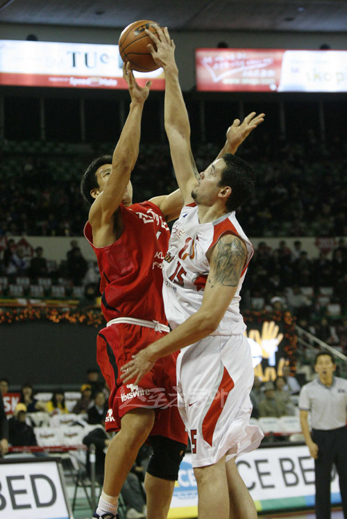 15일 오후 잠실학생체육관에서 열린 2009 남자프로농구 서울 SK 나이츠 대 인천 전자랜드의 경기. 전자랜드 이현호의 공격을 SK 김민수가 블로킹하고 있다.