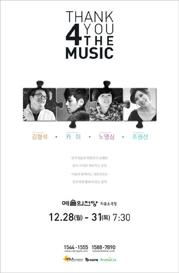 싱글 ‘벌’을 발표한 크로스오버 가수 카이(본명 정기열)가 프로듀서 김형석, 노영심, 롤러코스터 출신의 조원선과 함께 28일부터 31일까지 서울 서초동 예술의 전당 자유소극장에서 ‘생큐 포 더 뮤직’이라는 이름으로 합동 콘서트를 한다.