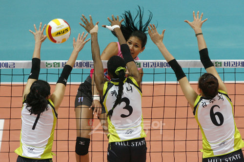 17일 인천 도원시립체육관에서 열린 2009-2010 V리그 흥국생명과 현대건설의 경기에서 흥국생명 카리나가 수비벽을 두고 공격하고 있다.