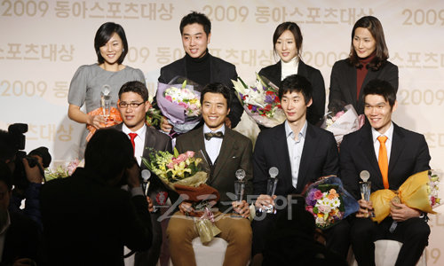 21일 서울 소공동 조선호텔 그랜드 볼룸에서 열린 2009동아스포츠대상에서 영광의 대상을 수상한 수상자들이 귀빈들과 함께 포즈를 취하고 있다. (서희경 여자프로골프대상, 배상문 남자프로골프대상, 황연주(흥국생명 김연경 대리수상) 여자배구대상, 신정자 여자프로농구대상, 김주성 남자프로농구대상, 박철우 남자배구 대상, 이동국 프로축구대상, 김상현 프로야구대상 이상 뒷줄왼쪽부터시계방향)