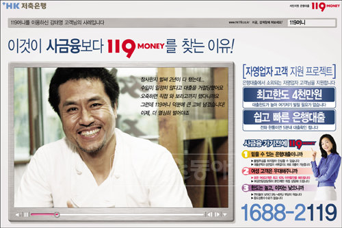 HK저축은행이 9월부터 시작한 HK저축은행 119머니 광고캠페인은 ‘서민들을 위한 은행대출’을 콘셉트로 내세워 주목을 받았다. 형식적으로는 광고구성 자체를 마치 인터넷 검색창에 동영상이 직접 실행되는 듯한 연출로 인터넷 검색을 통해 사례를 확인하는 것과 같은 현실감을 줬고, 다양한 고객들의 경험담을 인터뷰 형식으로 소개하는 방식을 선택해 공감을 얻은 것이다.