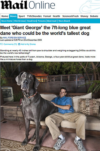 영국 대중지 데일리메일 인터넷 판은 22일(현지시간) 미국 애리조나 주 투싼에 사는 ‘조지’라는 이름의 그레이트 데인(Great Dane)종 개가 ‘세계에서 가장 큰 개’에 도전한다고 보도했다.