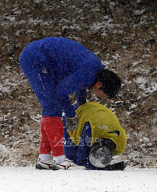 27일 파주 NFC에서 열린 축구국가대표팀 연습경기에서 이동국이 드리블도중 상대수비수와의 볼다툼으로 부상을 입고 괴로워하고 있다.