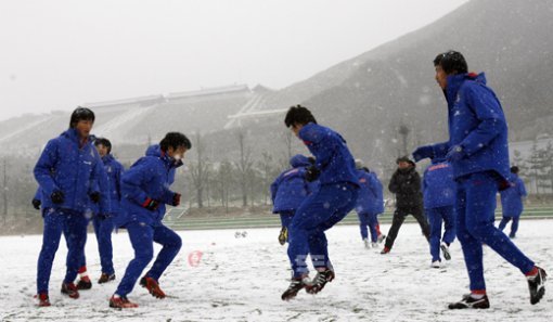 “눈발 뚫듯 경쟁 뚫어라” 27일 파주NFC에서 열린 대표팀 훈련. 선수들은 살아남기 위해 눈발을 뚫었다. 월드컵 무대를 밟기 위해서는 사실상 3:1의 경쟁을 뚫어야 한다.