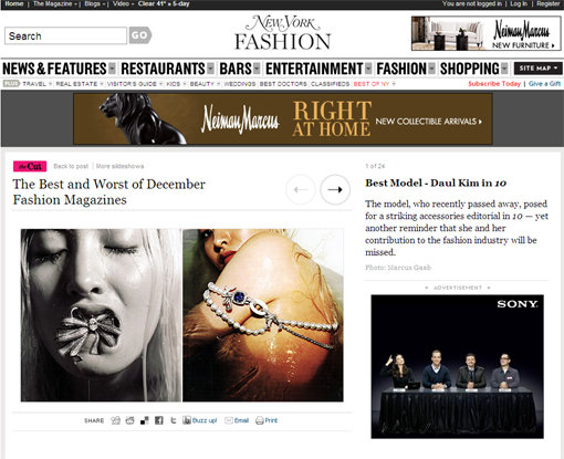 뉴욕매거진닷컴에 실린 고 김다울 화보.