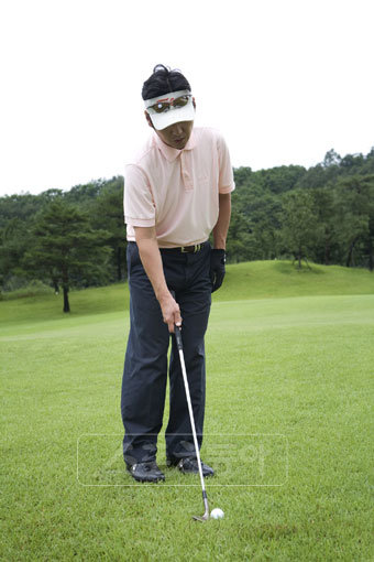 먼저 볼의 위치는 왼발에 두고 체중도 왼발에 둔다.