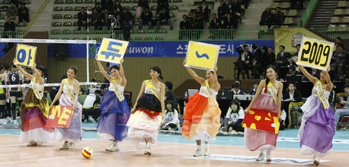 30일 수원실내체육관에서 열린 2009-2010 V리그 현대건설과 KT&G의 경기에서 치어리더들이 새해를 앞두고 한복을 입고 공연을 하고 있다.
