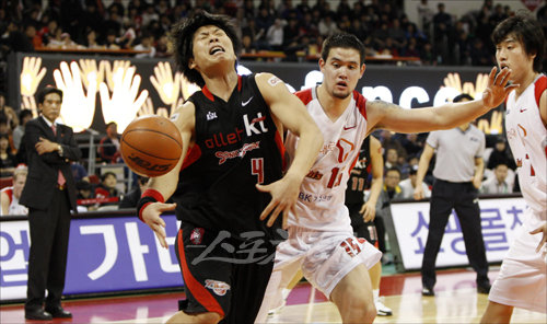 3일 오후 서울 잠실학생체육관에서 열린 2009∼2010 KCC 프로농구 서울 SK 나이츠 대 부산 KT 소닉붐의 경기에서 KT 박상오가 SK 김민수의 파울에 당하고 있다.