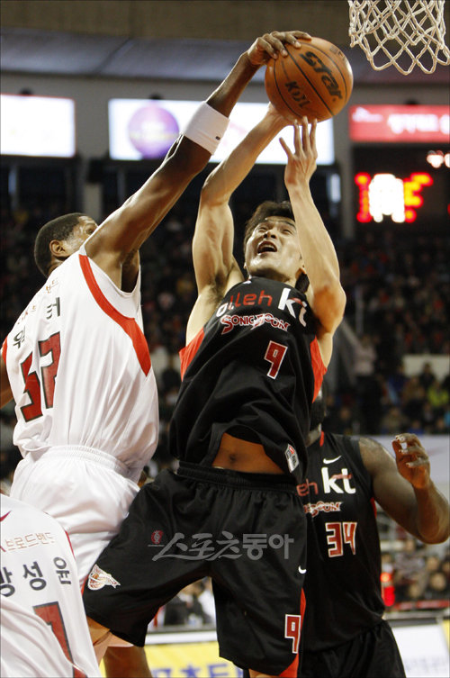 3일 오후 서울 잠실학생체육관에서 열린 2009∼2010 KCC 프로농구 서울 SK 나이츠 대 부산 KT 소닉붐의 경기에서 KT 조동현이 SK 용병 워커의 블록슛에 당하고 있다.