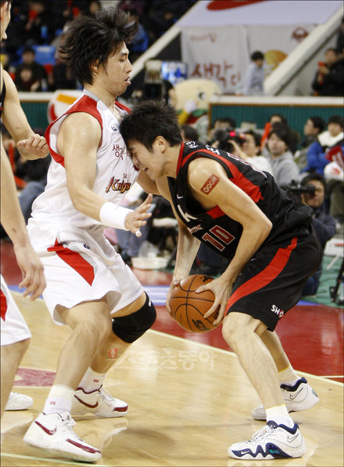 3일 오후 서울 잠실학생체육관에서 열린 2009∼2010 KCC 프로농구 서울 SK 나이츠 대 부산 KT 소닉붐의 경기에서 KT 조성민이 SK 방성윤의 수비에 가로막혀 있다.