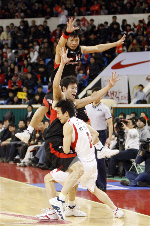 3일 오후 서울 잠실학생체육관에서 열린 2009∼2010 KCC 프로농구 서울 SK 나이츠 대 부산 KT 소닉붐의 경기에서 SK 박성운이 KT 박상오(위)와 조성민의 수비에 가로막혀 백코트를 하지 못하고 있다.