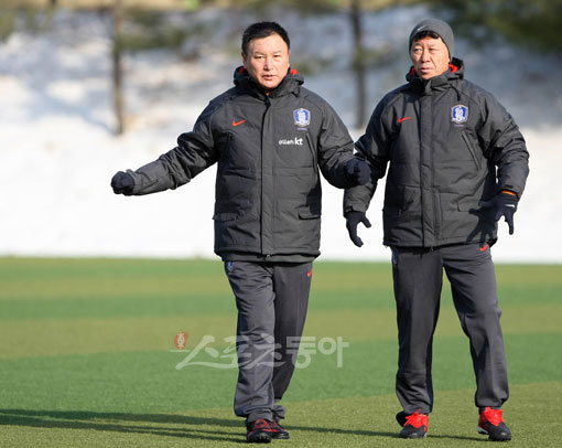 2010년 남아프리카공화국 월드컵을 대비한 남아공,스페인 전지훈련을 위해 축구국가대표팀 선수들이 3일 파주NFC(대표팀트레이닝센터)에 소집돼 새해 첫 훈련을 했다. 허정무감독과 정해성 코치가 훈련에 대해 이야기 나누고 있다.