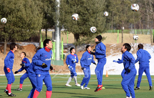 대표팀 선수들이 추운 날씨에도 밝은 표정으로 본격적인 훈련에 앞서 패스를 주고받으며 몸을 풀고 있다.