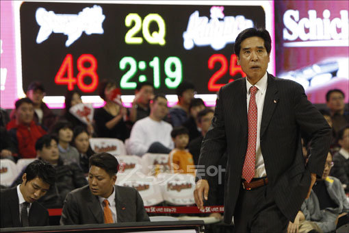 3일 오후 서울 잠실학생체육관에서 열린 2009∼2010 KCC 프로농구 서울 SK 나이츠 대 부산 KT 소닉붐의 경기에서 2쿼터서 부터 점수차가 크게 뒤지며 벌어지자 SK 신선우 감독의 표정이 무겁다.
