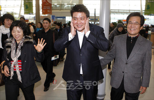 일본 프로야구 무대에 진출한 김태균(28·지바 롯데)이 팀의 2군 훈련조에 합류하기 위해 5일 오전 인천국제공항을 통해 출국했다. 김태균이 부모님의 배웅을 받으며 출국장으로 향하고 있다.