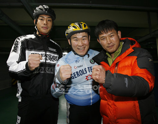 남유종(왼쪽)은 세계선수권대회에서 우승한 국제적 인라인롤러 스타지만 비인기종목의 설움에 가슴이 시리다. 그러나 오늘도 광저우아시안게임 금메달을 다짐하며 전영희 기자, 용백수 교육이사(오른쪽)와 함께 힘찬 파이팅을 외쳤다.