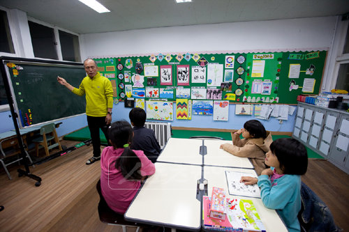 거문초등학교 동도분교의 4명뿐인 전교생을 대상으로 미술 수업을 하고 있는 허영만 선장. 섬 아이들이 눈을 초롱초롱 빛내며 설명을 듣고 있다.