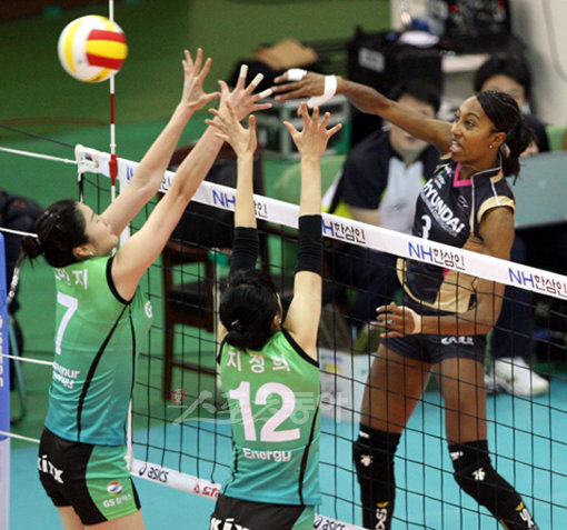 6일 수원실내체육관에서 열린 프로배구 V-리그 여자부 현대건설과 GS칼텍스의 경기에서 현대건설의 해결사 케니가 GS칼텍스의 수비벽을 앞에 두고 파워 넘치는 스파이크를 하고 있다.