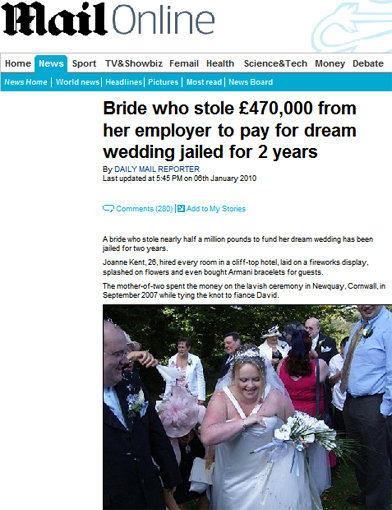 영국 대중지 데일리메일은 6일(현지 시간) “경찰이 회사 자금 47만 파운드(약 8억5000만원)를 빼돌려 결혼식 등 개인 용도로 사용한 조안 켄트(26)를 붙잡았다”고 전했다.