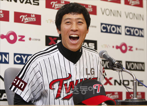 3년간의 일본 생활을 마치고 돌아온 이병규(36)가 8일 오후 서울 잠실야구장 LG 트윈스 본사 사무실에서 입단 기자회견을 했다. LG트윈스와 2년간 총 9억 원에 입단 계약을 맺은 이병규가 기자회견 도중 함박웃음을 터뜨리고 있다.