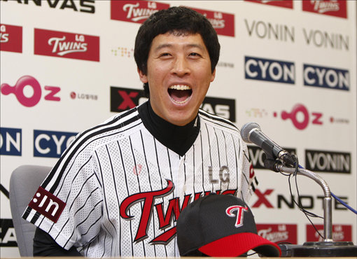 “웃는게 웃는 게 아니야∼”3년간의 일본 생활을 끝낸 이병규가 8일 LG와 계약을 마치고 국내 복귀를 공식 선언했다. 기자회견에서 이병규는 “국가대표급 외야수들 간 경쟁을 뚫고 주전을 확보해 달라진 LG의 모습을 보여주고 싶다”는 포부를 밝혔다.