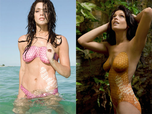 그녀는 수영복 대신 핑크색과 오렌지색 비늘 무늬의 바디 페인팅으로 파격적인 모습을 선보여 눈길을 끌고 있다.