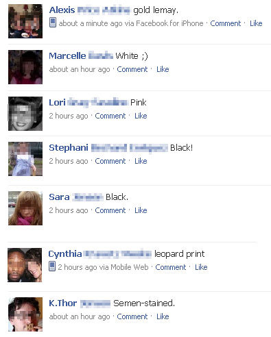 여성 이용자들의 상태표시가 색상으로 바뀐 페이스북 게시판. 의미파악에 나선 누리꾼들의 광클로 구글 인기검색어 11위에 오르기도 했다.