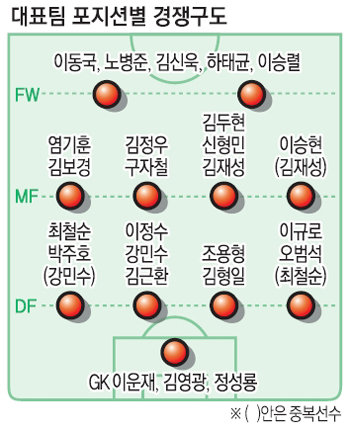 골키퍼는 ‘백전노장’ 이운재를 비롯해 김영광, 정성룡 등 3명이 확정적이다. 이변이 없는 한 이들이 월드컵 엔트리에 포함될 것으로 보인다.