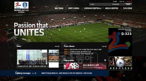 2022월드컵유치위원회가 공식 홈페이지(www.korea2022.org)를 개설해 운영에 들어갔다고 12일 밝혔다. 홈페이지에는 한국의 월드컵 유치 당위성, 개최 도시 및 경기장 소개, 한국 축구의 역사와 실태 등이 우리말과 영어로 게재됐다. 서대원 유치위 사무총장은 “개최지가 국제축구연맹(FIFA) 집행위원 24명의 투표로 결정되지만 전 세계 축구 공동체의 의사가 반영되므로 모든 면에서 경쟁한다. 홈페이지도 경쟁력 강화의 한 요소”라고 밝혔다.