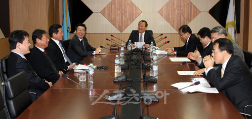 한국야구위원회(KBO) 유영구 총재(가운데)와 각 구단 사장들이 12일 이사회를 열면서 담소를 나누고 있다. KBO 이사회는 지난해 처음 도입된 ‘무승부=패배’ 방식을 올해도 지속하기로 결정했다.