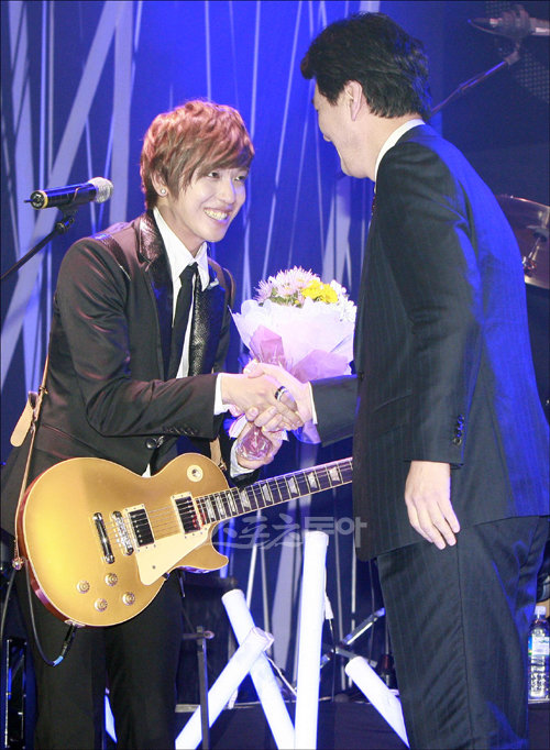 SBS 드라마 ‘미남이시네요’ 의 ‘수건남’ 정용화(왼쪽)가 소속 된 그룹 씨엔블루(CNBLUE)가 14일 오후 서울 섬유센터에서 미니음반 ‘블루토리’ 발매 기념 쇼케이스를 가진 가운데, 정용화의 동명이인인 정용화 청와대 대통령실 연설기록보좌관이 깜짝 방문해 꽃다발을 건네고 있다.