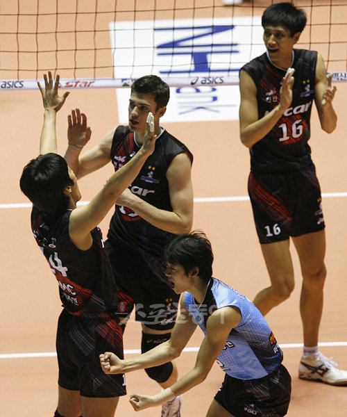 14일 장충체육관에서 열린 2009-2010 V리그 현대캐피탈과 우리캐피탈의 경기에서 현대캐피탈이 공격에 성공한 뒤 기뻐하고 있다.