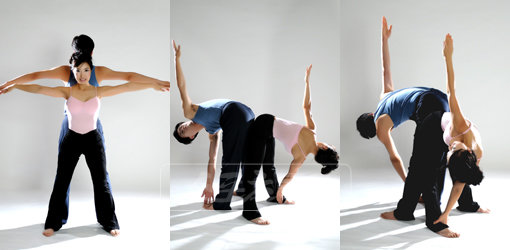 1. 남녀 서로 등을 맞대고 바로 서서 양발을 어깨넓이로 벌린 뒤 숨을 들이마시며 양팔은 좌우 수평으로 들어준다.