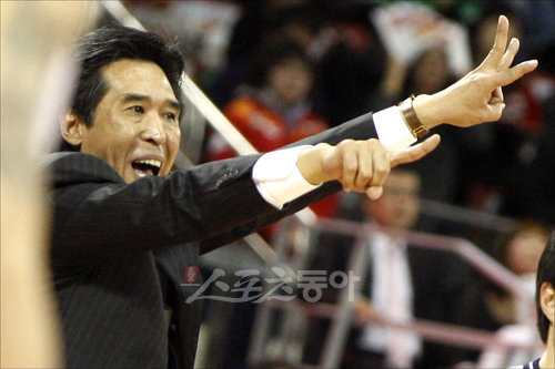 17일 오후 서울 잠실학생체육관에서 열린 2009~2010 KCC프로농구 서울 SK나이츠 대 안양 KT&G의 경기에서 SK 신선우 감독이 선수들에게 작전을 지시하고 있다.