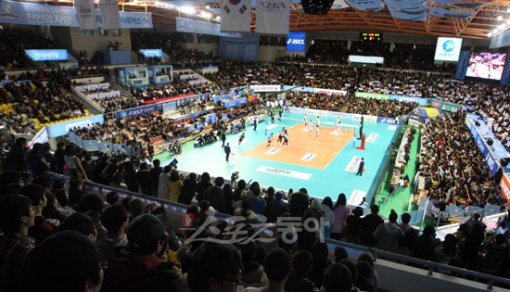 입추의 여지없이 가득 찬 스탠드. 17일 현대캐피탈과 삼성화재의 V리그 ‘라이벌 빅뱅’이 펼쳐진 천안 유관순체육관은 7167명 팬들이 지르는 함성으로 내내 뜨거웠다. 체육관의 공식 수용 규모는 6000명. 경기 시작 두 시간 전에는 빈 자리를 찾아볼 수 없었고, 밖에서는 수 백여 팬들이 줄을 서서 입장하고 있었다.