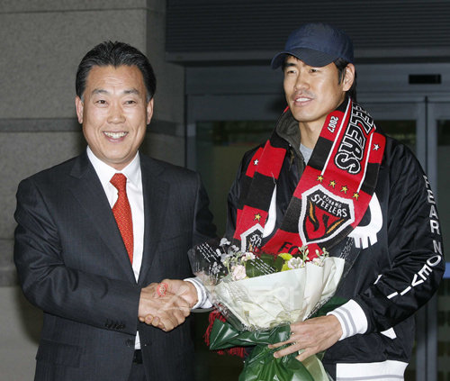 설기현이 포항 스틸러스와 1년 계약을 체결하고 18일 오후 인천공항을 통해 입국했다. 환영나온 한명희 포항 단장이 설기현과 악수를 나누고 있다.