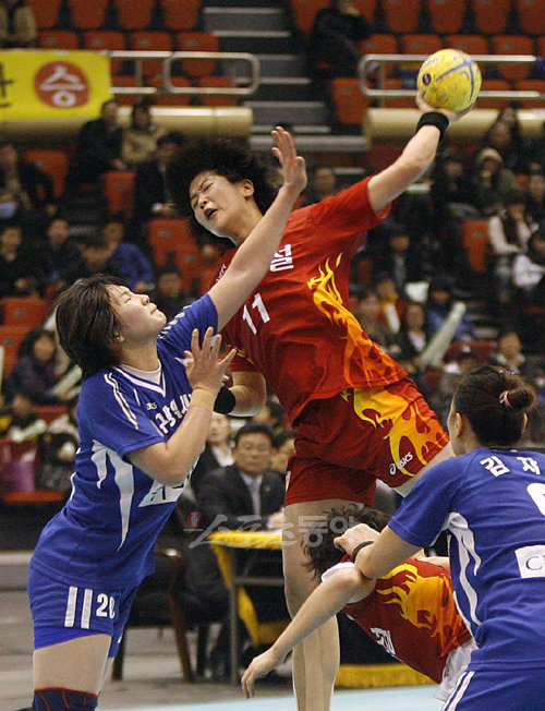 18일 오후 서울 송파구 방이동 펜싱경기장에서 열린 핸드볼큰잔치 벽산건설과 대구시청의 경기. 벽산건설 유은희가 대구시청 이민지의 수비를 피해 슛을 시도하고 있다.