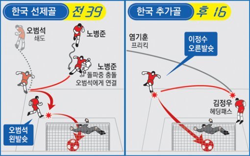 대표팀이 만들어낸 2번째 골은 세트피스 상황. 후반 16분 그리스 진영 오른쪽에서 얻은 프리킥을 염기훈이 왼발로 크로스 했다. 골대 앞으로 감아 찬 볼을 김정우가 골대 왼쪽에서 머리로 문전을 향해 패스했다. 이정수가 달려들면서 오른발로 볼을 차 넣어 그리스의 골망을 흔들었다.