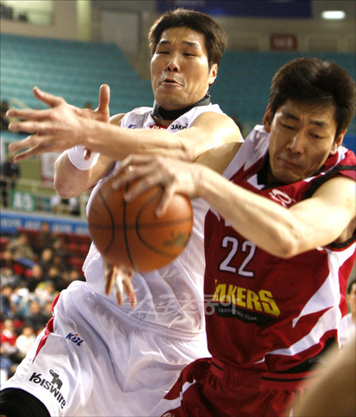 19일 오후 인천삼산월드체육관에서 열린 2009∼2010 KCC 프로농구 인천 전자랜드 엘리펀츠 대 창원 LG 세이커스의 경기에서 전자랜드 서장훈이 LG 이창수에게 공격 리바운드를 빼앗기고 있다.
