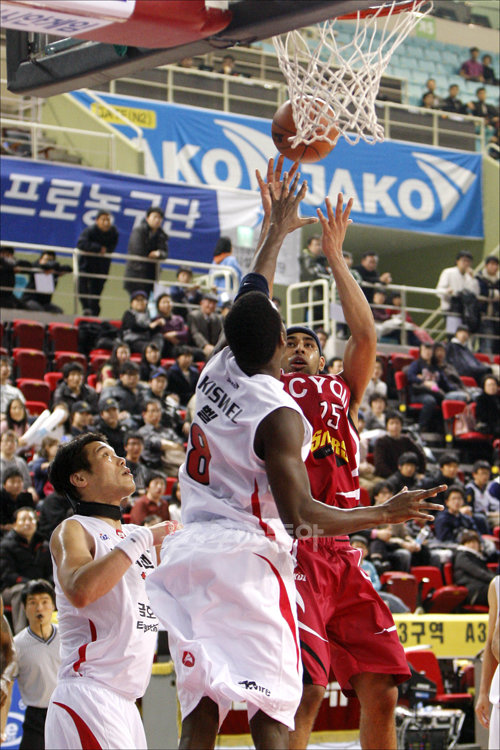 19일 오후 인천삼산월드체육관에서 열린 2009∼2010 KCC 프로농구 인천 전자랜드 엘리펀츠 대 창원 LG 세이커스의 경기에서 LG 문태영이 전자랜드 벨을 상대로 페이드어웨이슛을 시도하고 있다.
