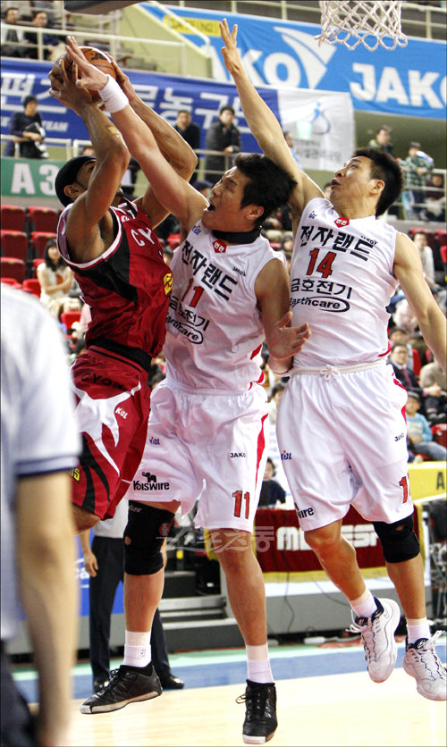 19일 오후 인천삼산월드체육관에서 열린 2009∼2010 KCC 프로농구 인천 전자랜드 엘리펀츠 대 창원 LG 세이커스의 경기에서 전자랜드 서장훈(가운데)과 이현호가 LG 문태영의 공격을 막기 위해 안간힘을 쓰고 있다.