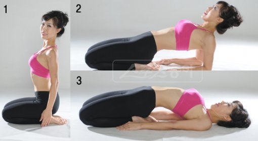 ※ 효과: 허벅지 전면 근육을 이완시켜 다이어트를 유도하고, 허리와 엉덩이 근육의 수축력을 강화해 탄력 있게 만들며 가슴과 굽은 등을 펴준다. 신체 전면 부위를 늘려주고 뒷부분을 수축시키는 동작으로 하체 다이어트에 탁월하다. ※주의: 무릎을 모으는 방향으로 힘을 주어 치골 주변의 수축력 및 탄력을 강화하는 것이 중요하다. 허리 디스크가 심한 환자의 경우 삼가한다.