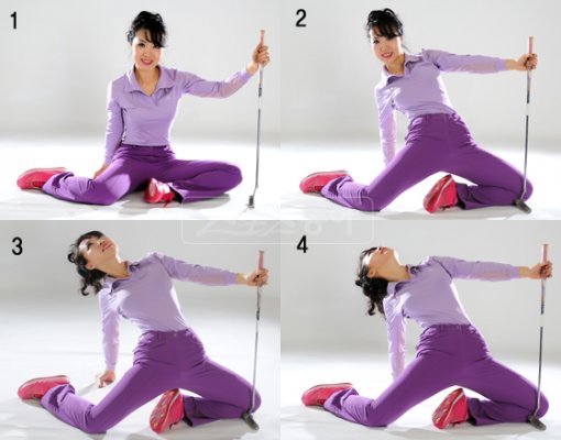 ※주의점: 고혈압 환자는 고개를 너무 뒤고 젖히지 말고 개인능력에 맞게 수련한다. 퍼터를 지팡이처럼 체중을 실어 몸을 들어 올릴 때 퍼터의 헤드가 앞으로 밀려나가지 않도록 유의한다.