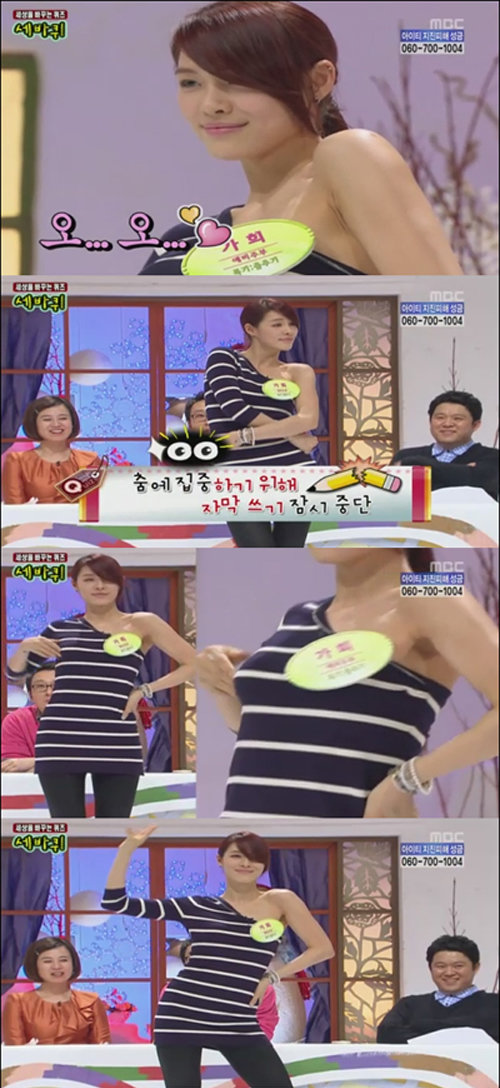 가희는 23일 MBC '세상을 바꾸는 퀴즈'(이하 세바퀴)에 게스트로 출연해 외국 음악에 맞춰 특별히 준비한 춤을 선보였다.