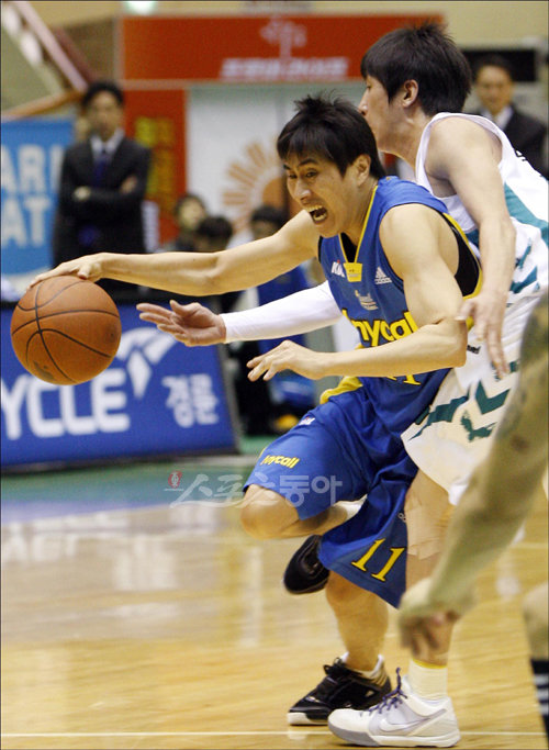 24일 원주치악체육관에서 열린 2009∼2010 KCC 프로농구 원주 동부 프로미 대 서울 삼성 썬더스의 경기에서 삼성 이상민이 동부 박지현을 뚫고 돌파를 시도하고 있다.