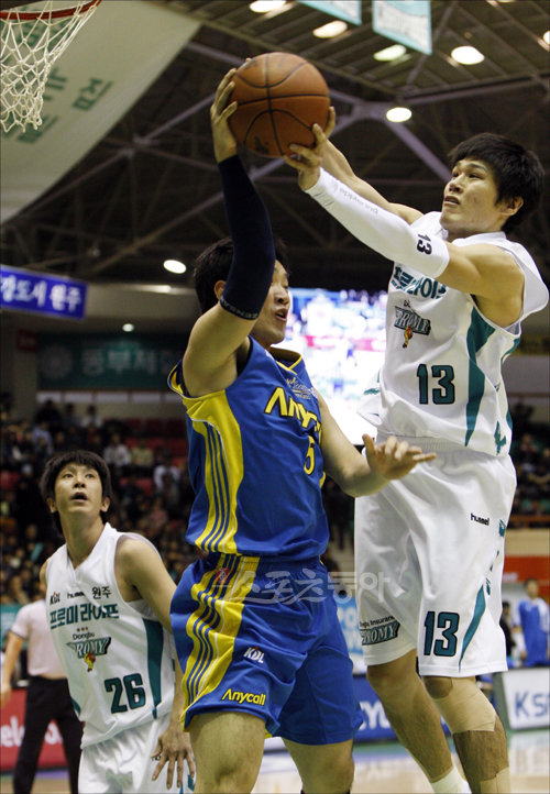 24일 원주치악체육관에서 열린 2009∼2010 KCC 프로농구 원주 동부 프로미 대 서울 삼성 썬더스의 경기에서 삼성 이원석이 골밑에서 볼을 외곽으로 빼내는 것을 동부 윤호영이 가로채고 있다.