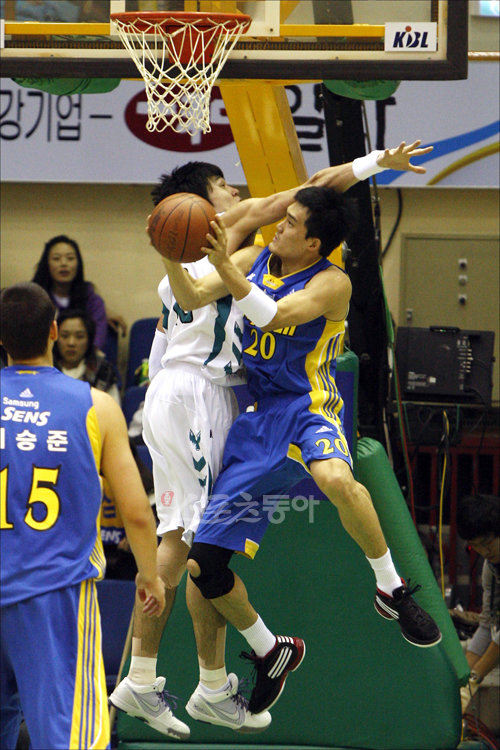 24일 원주치악체육관에서 열린 2009∼2010 KCC 프로농구 원주 동부 프로미 대 서울 삼성 썬더스의 경기에서 삼성 차재영이 동부 김주성의 수비를 피해 더블클러치를 시도하고 있다.