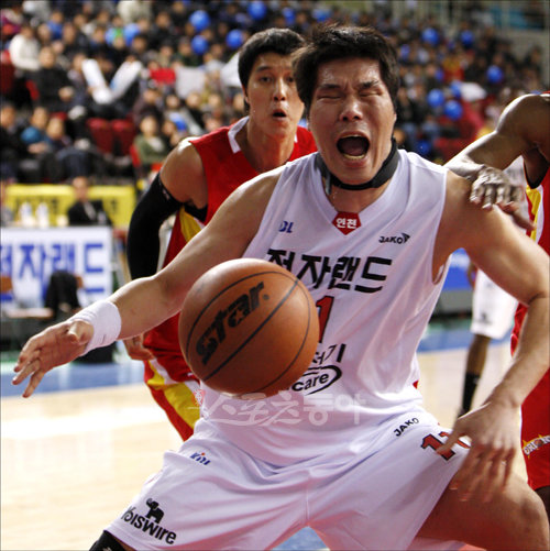 26일 오후 인천삼산월드체육관에서 열린 2009∼2010 KCC 프로농구 인천 전자랜드 엘리펀츠 대 대구 오리온스의 경기에서 전자랜드 서장훈이 상대 수비의 반칙에 당하고 있다.